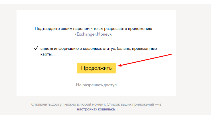 - В этот момент вы будете перенаправлены на сайт Юмани в свой кошелек. Тут потребуется нажать на ссылку «Продолжение», а также ввести пароль от своего кошелька или подтвердить через приложение на телефоне, чтобы иметь возможность связать электронные кошельки.